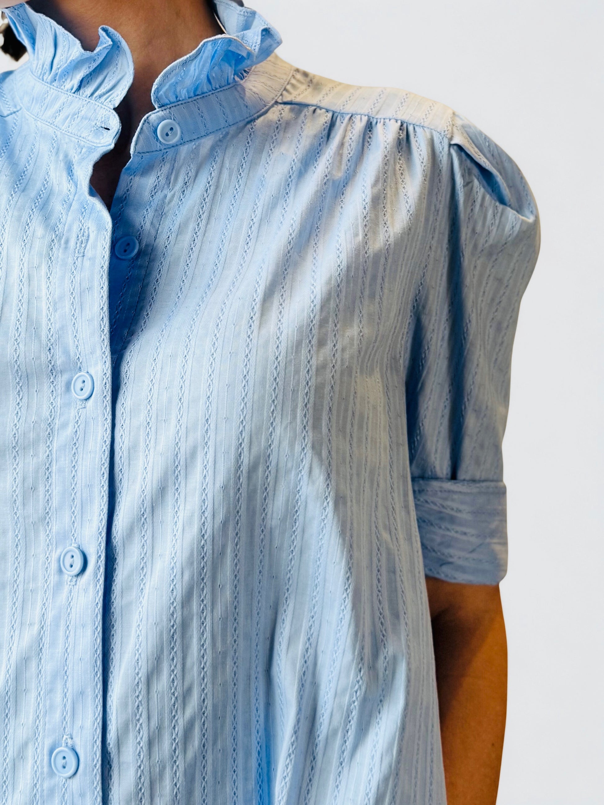 Elevate your wardrobe with the AD Callie Blue, a charming shirt dress that combines timeless elegance with playful details. The ruffled collar adds a touch of sophistication, while voluminous puff sleeves create a romantic, flattering silhouette. Perfect for dressing up casual occasions or layering over basics, this versatile piece transitions seamlessly from day to night. The structured shirt dress design offers comfort and style, making it an essential addition to any fashion-forward closet.