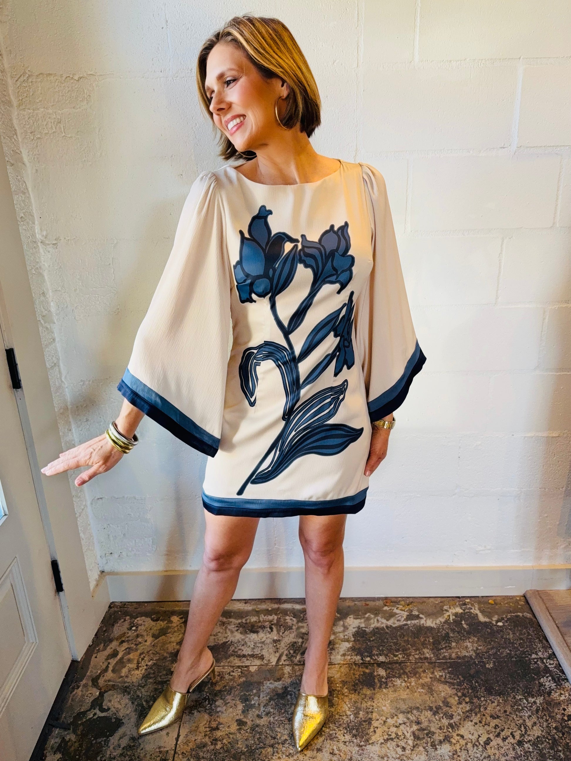 Elevate your everyday wardrobe with this charming beige dress featuring a delicate blue floral design. The soft, neutral base pairs beautifully with the navy botanical print, creating a special piece for special occasions.