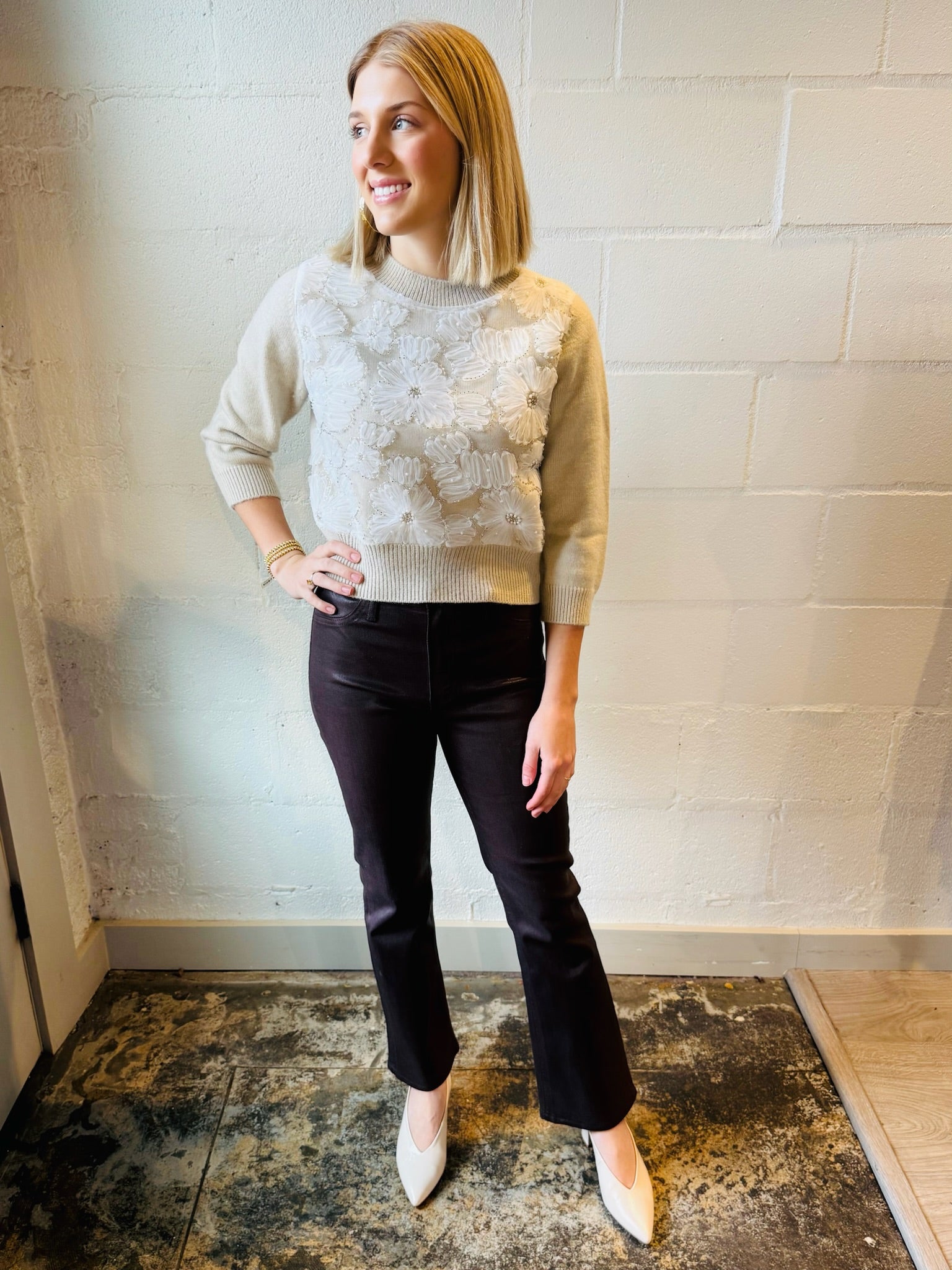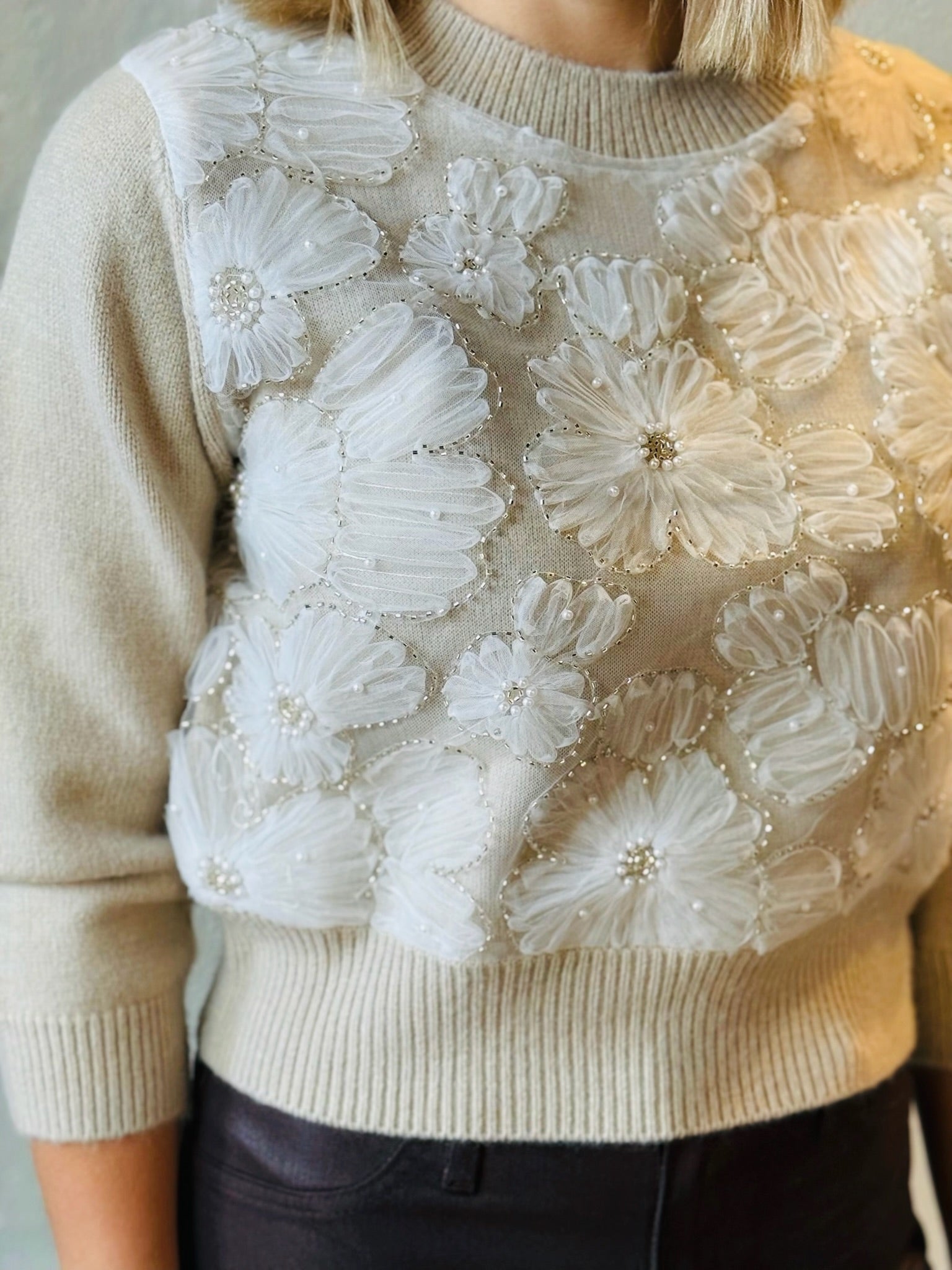 Elevate your wardrobe with the AS ISABELLA FLRL SWTR, a cream sweater adorned with delicate floral beading. This elegant piece offers a subtle touch of sophistication, perfect for adding charm to any outfit. Soft and comfortable, it blends cozy warmth with intricate detail, making it an ideal choice for both casual and dressier occasions. Embrace style and comfort effortlessly with this beautifully crafted sweater.