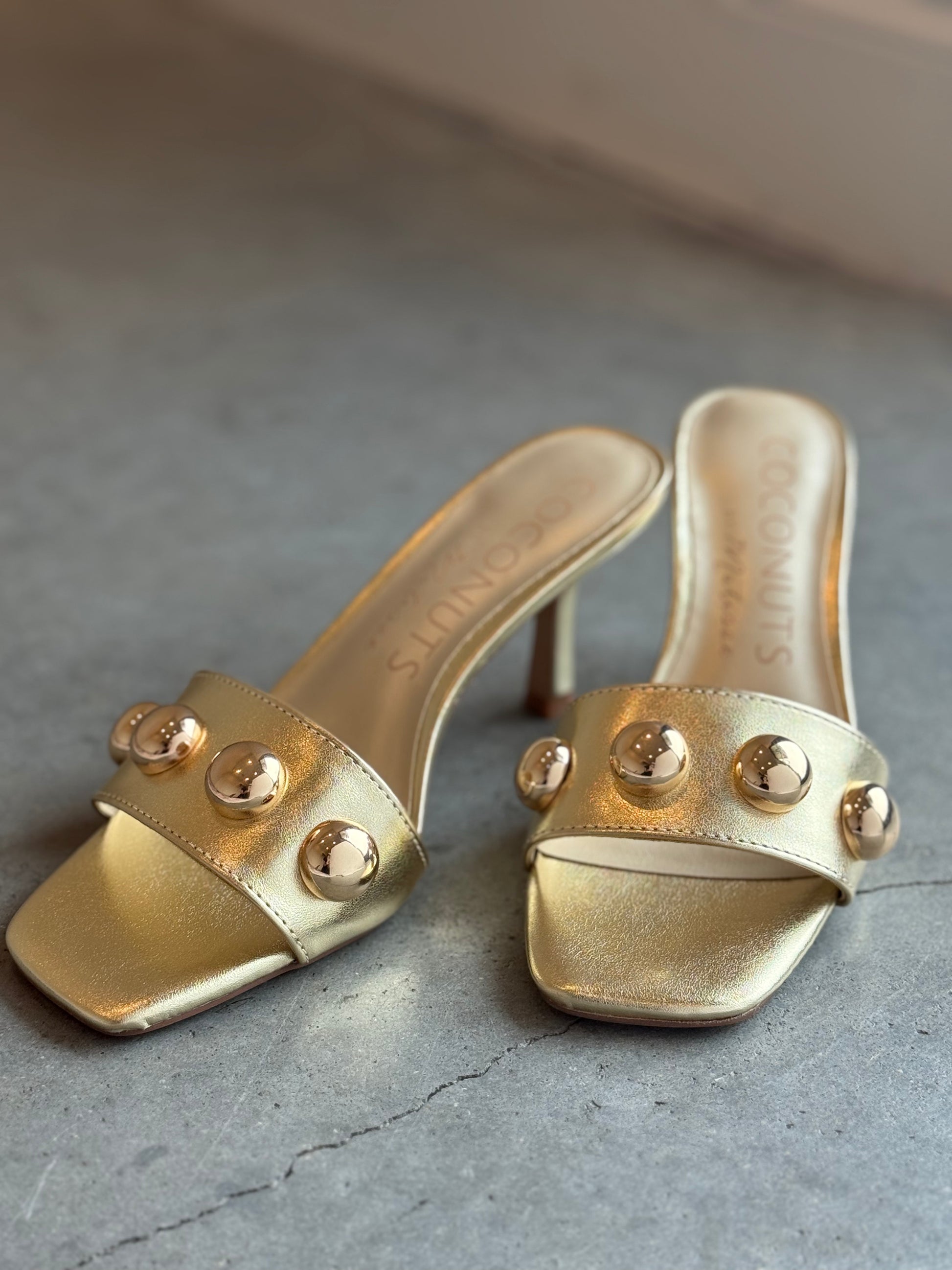 Step into elegance with the ATM THEO GOLD slip-on sandal. Featuring a chic square toe and delicate button embellishments, this sandal combines modern design with subtle sophistication. The tapered heel adds just the right lift for a flattering silhouette, making it perfect for both casual outings and dressier occasions. Elevate your style effortlessly with these versatile gold sandals that blend comfort and class.