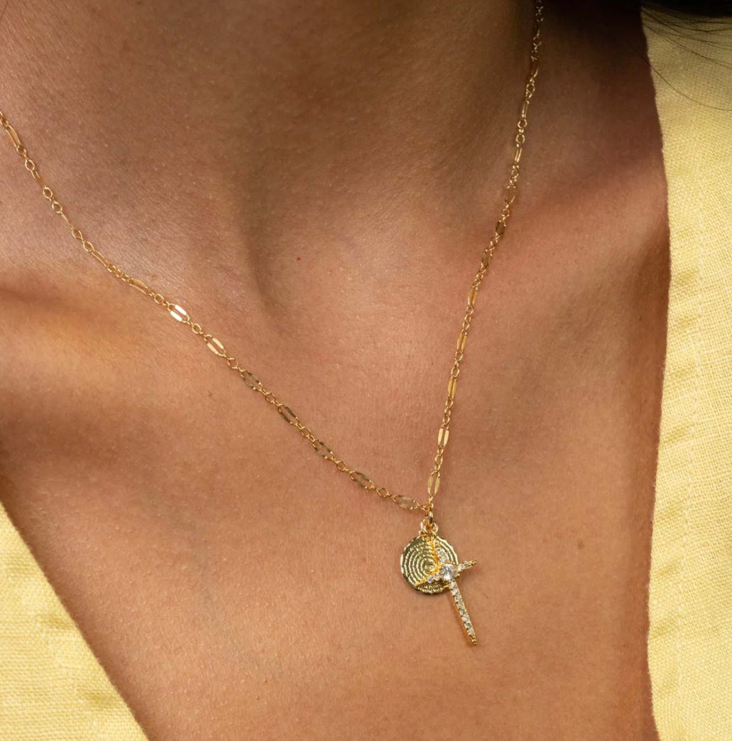 14k gold filled chain with extra sparkly mini cz cross and our father's prayer mini pendant.