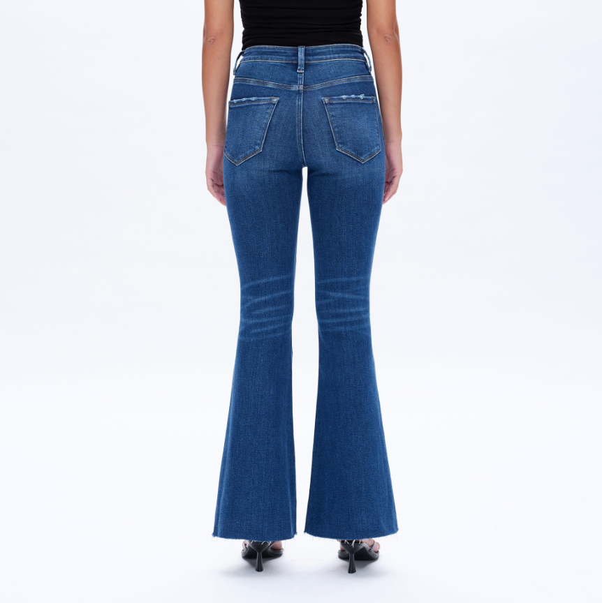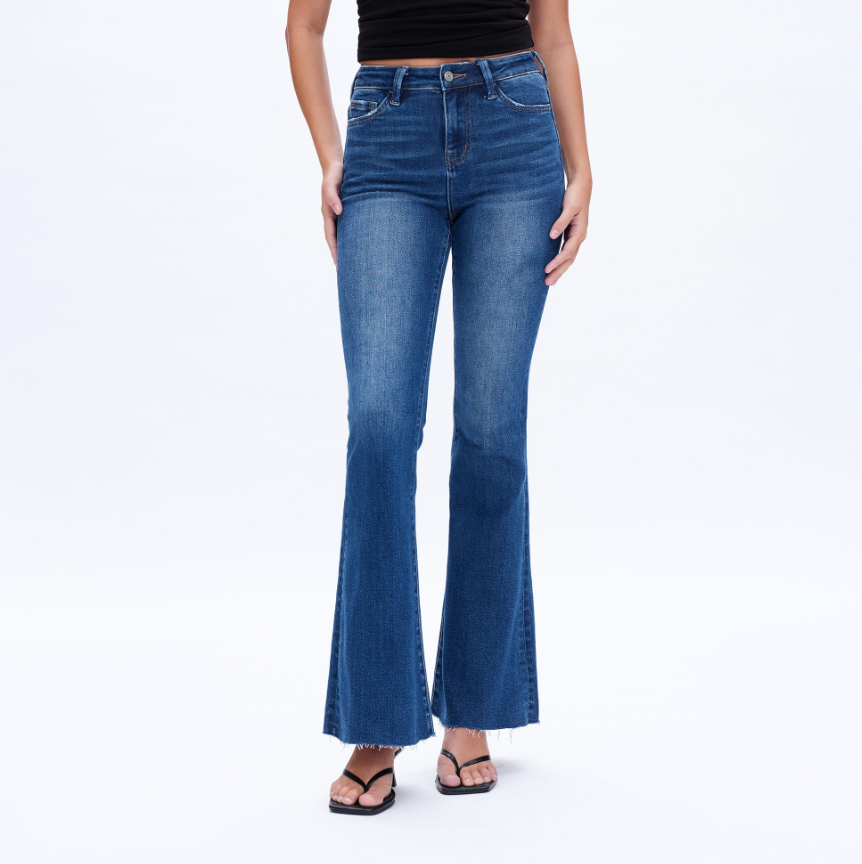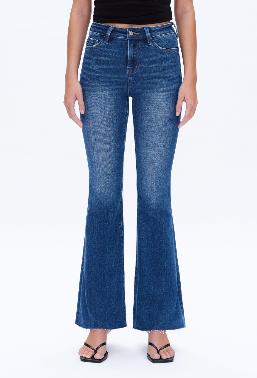 Retro flare jeans in a faded wash, featuring subtle whiskering and distressed details that accentuate the bold wide-hem silhouette.
