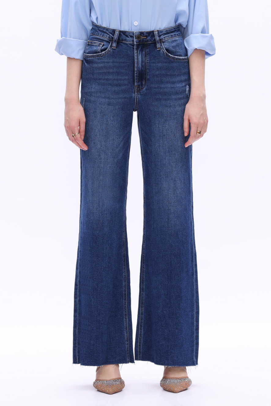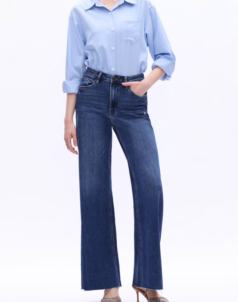 Wide-leg jeans with a flattering high-rise fit and raw hem, offering a chic and modern update to timeless denim style