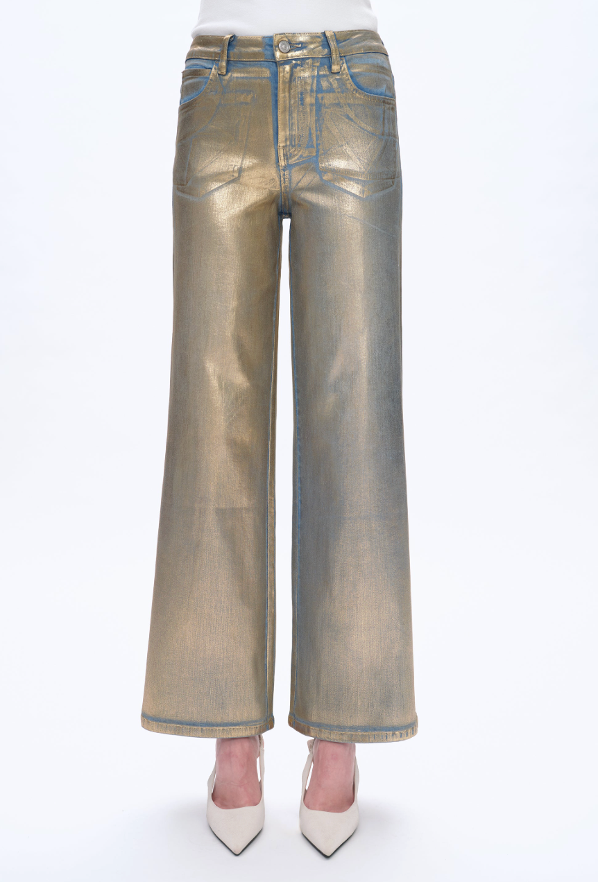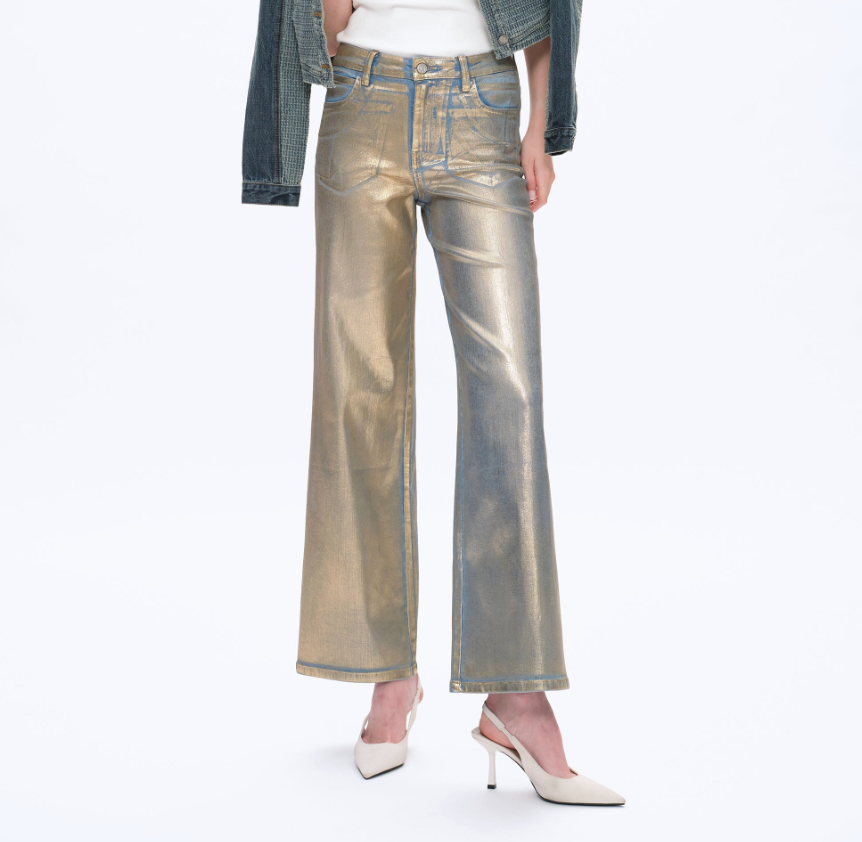 This metallic jeans features a clear washed background with luxurious bronzing, perfect for parties and concerts.