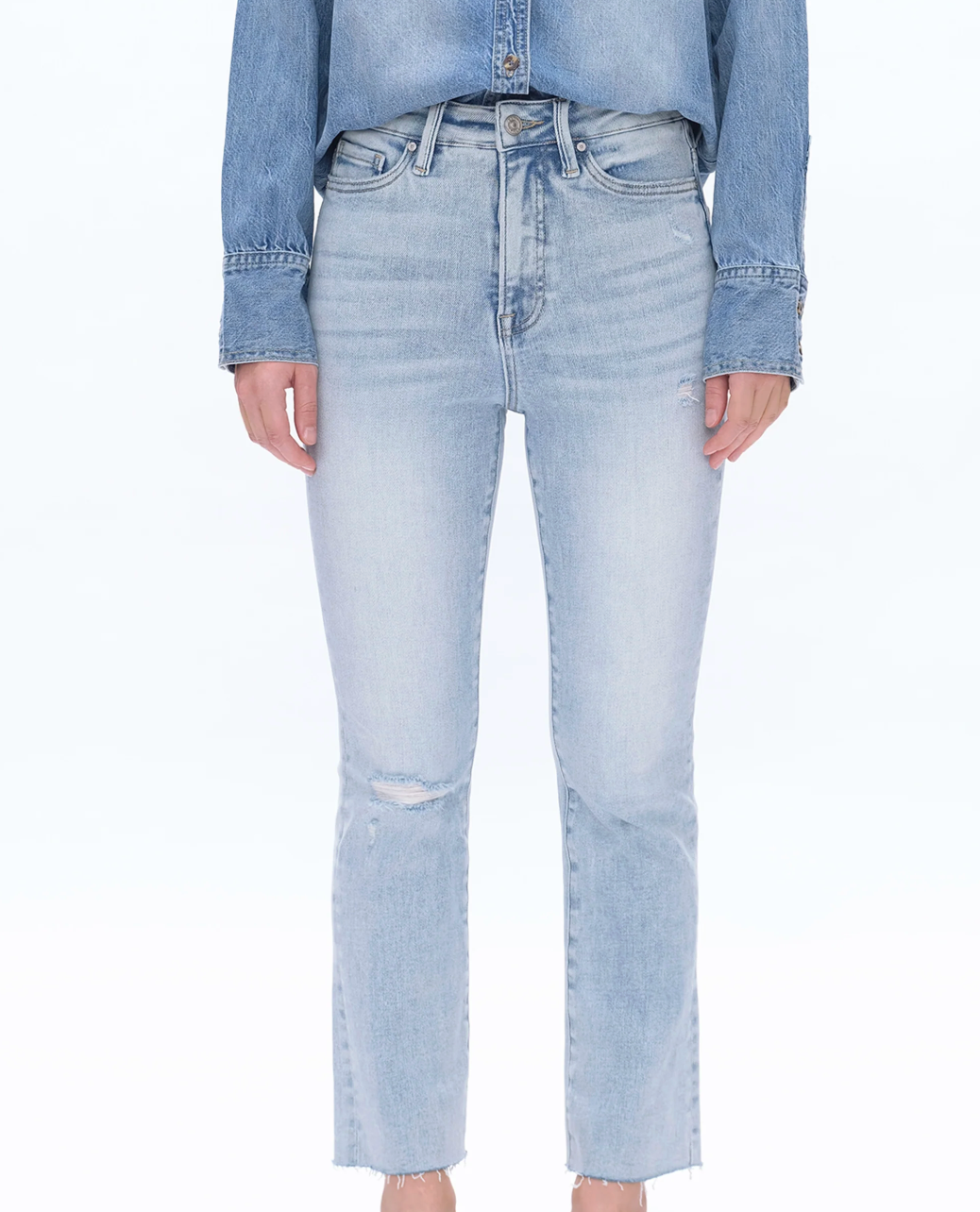 They feature a flattering straight-leg fit and a trendy frayed hem.