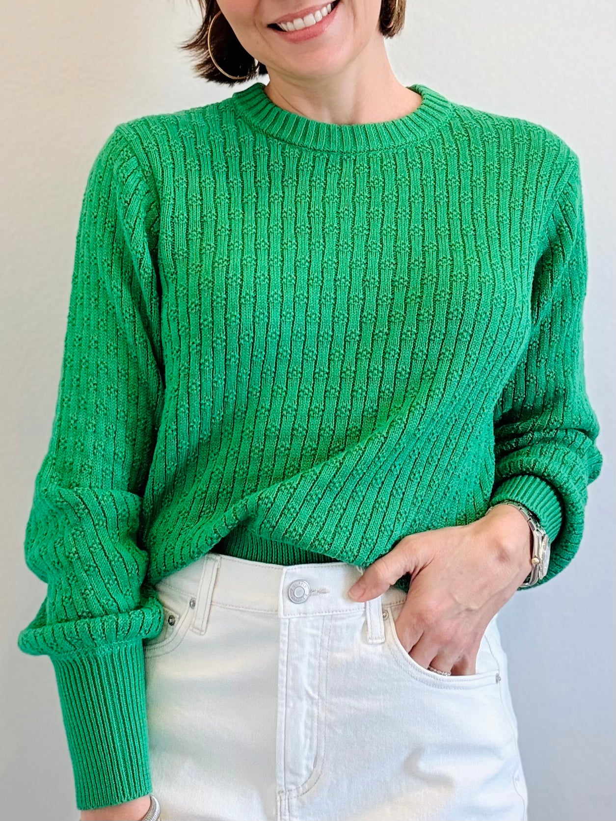 Textured sweater featuring a subtle honeycomb knit, straight silhouette and ribbed crew neck. Finished with wide ribbed cuffs and hem for a structured edge.