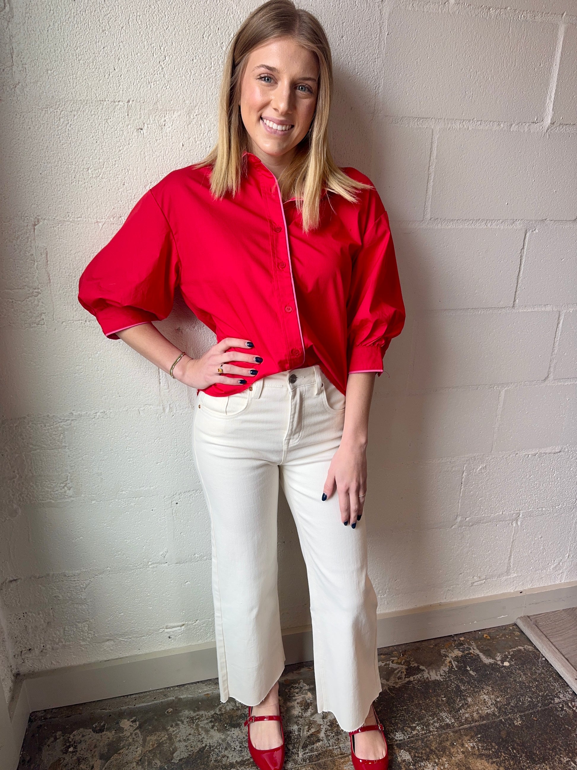Elevate your everyday wardrobe with the DM Kayla Red Top, a striking piece that combines classic style with modern flair. This vibrant red button-down features charming short bubble sleeves that add playful dimension, while delicate pink contrast piping traces the neckline and cuffs for a polished finishing touch. Perfect for dressing up or down, this versatile top transitions seamlessly from office to weekend brunch. The structured silhouette flatters all body types, making it an essential addition to any fashion-forward closet.