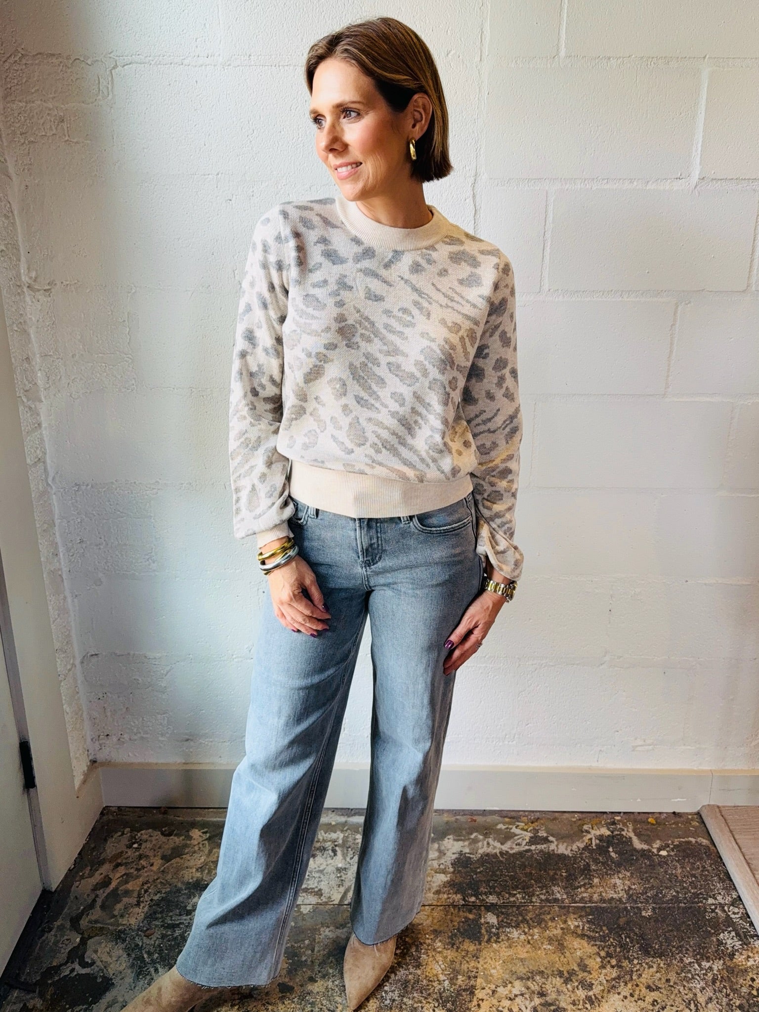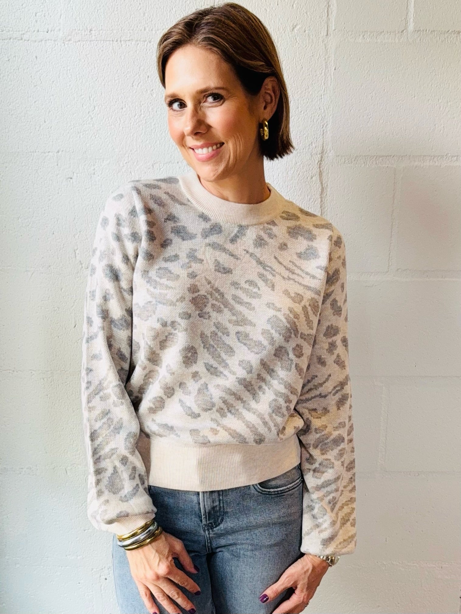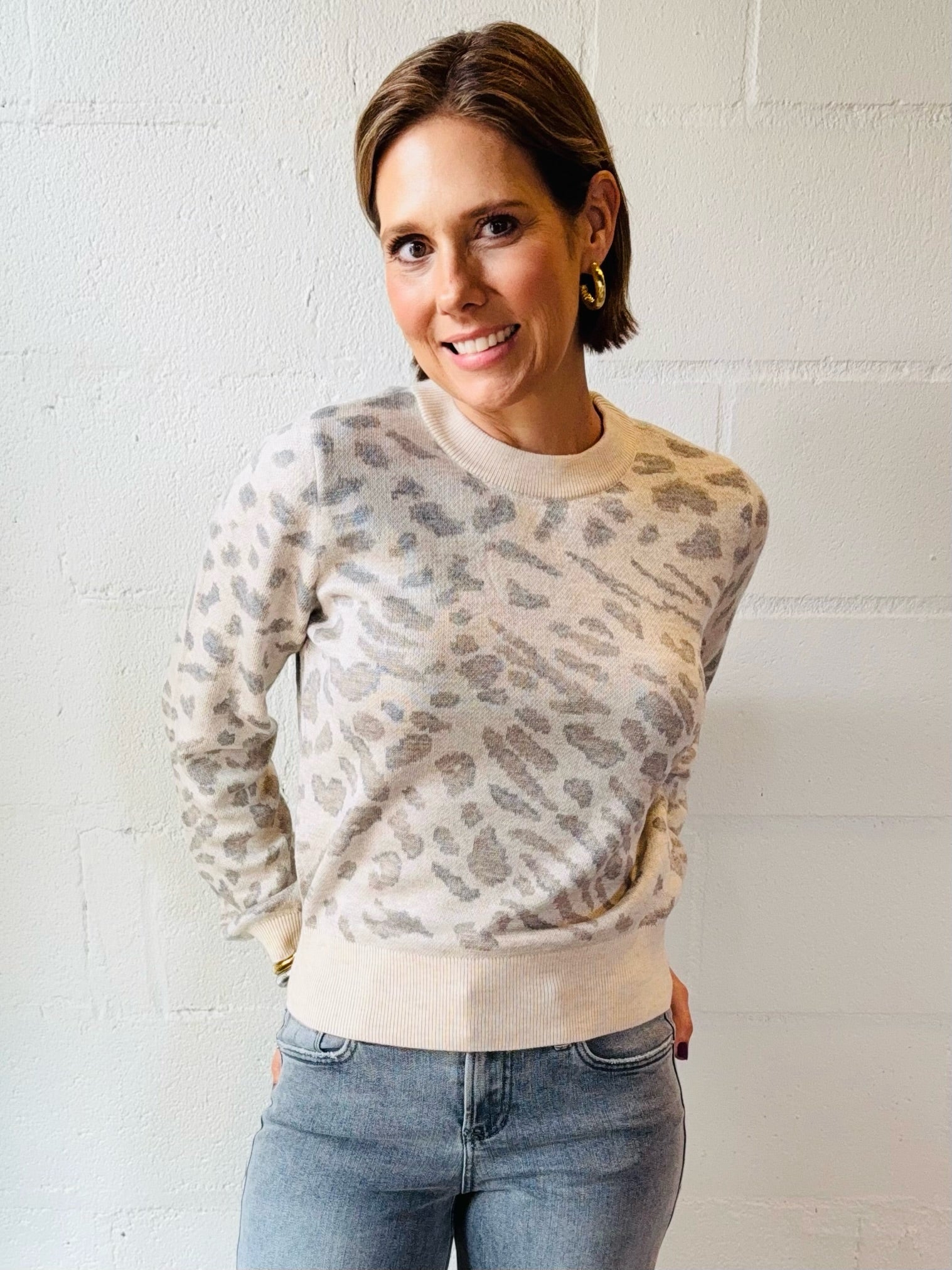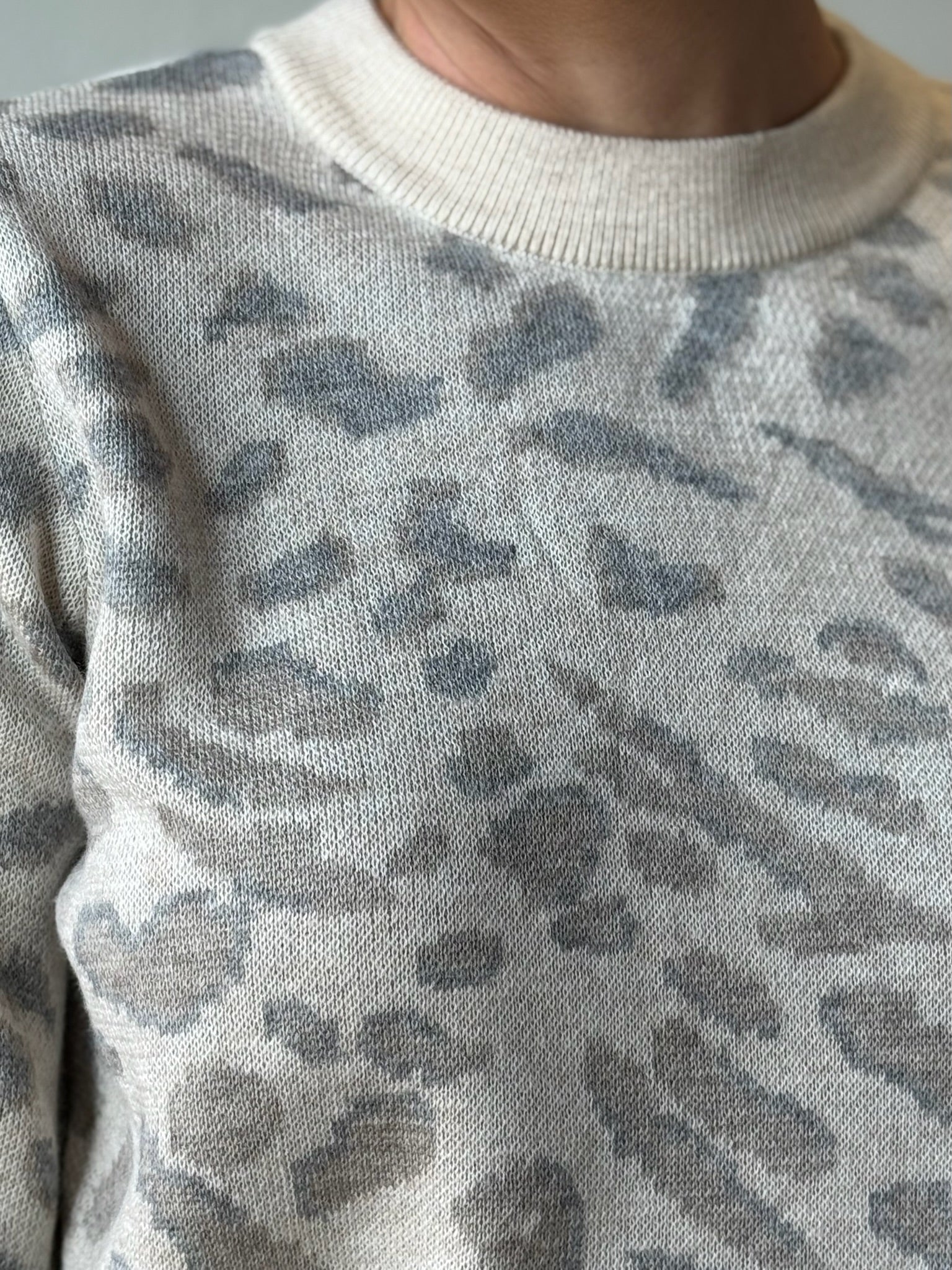 Elevate your everyday wardrobe with this stunning cream and grey animal print sweater. The sophisticated blend of neutral tones creates a versatile piece that pairs effortlessly with your favorite jeans or tailored trousers. Soft, comfortable fabric keeps you cozy throughout the day while the eye-catching animal print adds an instant touch of style and personality. Perfect for layering or wearing solo, this sweater transitions seamlessly from casual outings to polished office settings. A timeless addition that works harder than you'd expect.