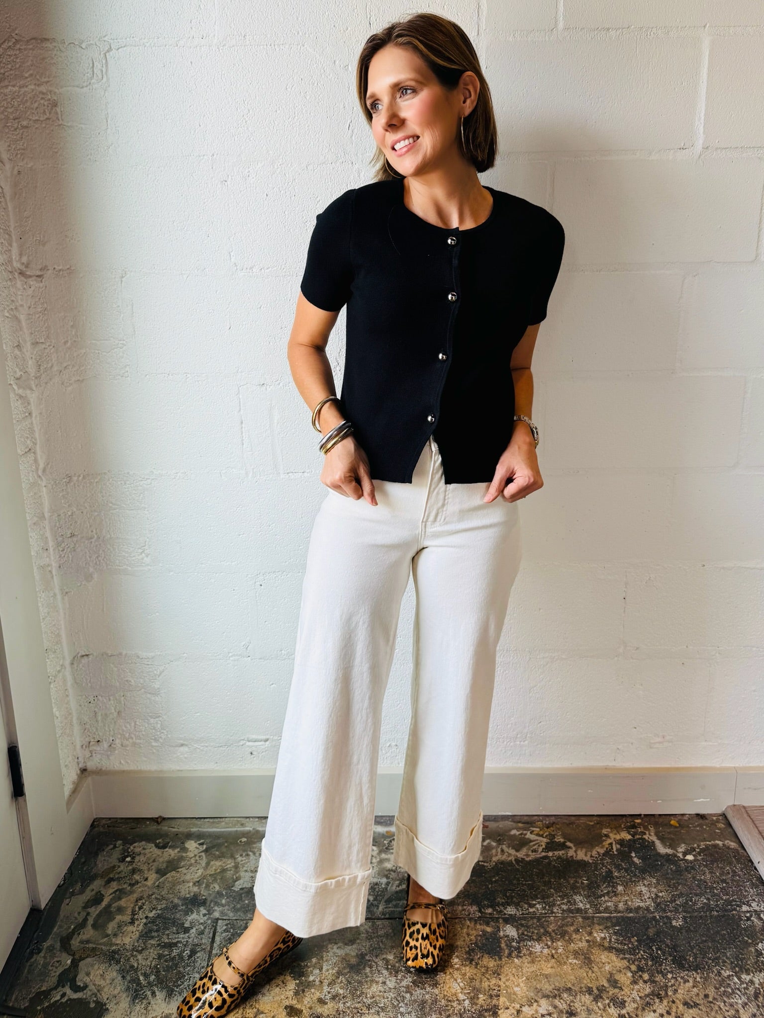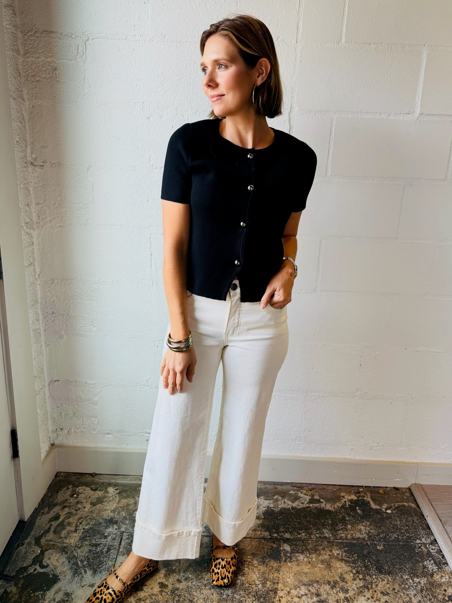 Elevate any outfit with the DR SIHAM black short sleeve cardigan. Its sleek design offers lightweight coverage, perfect for layering during transitional weather. Crafted for comfort and style, this versatile cardigan effortlessly complements both casual and dressy looks, making it an essential addition to your wardrobe.