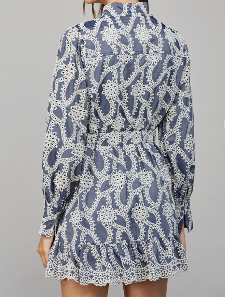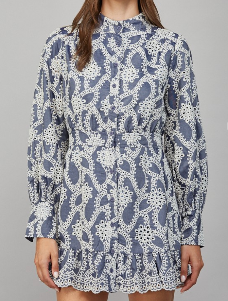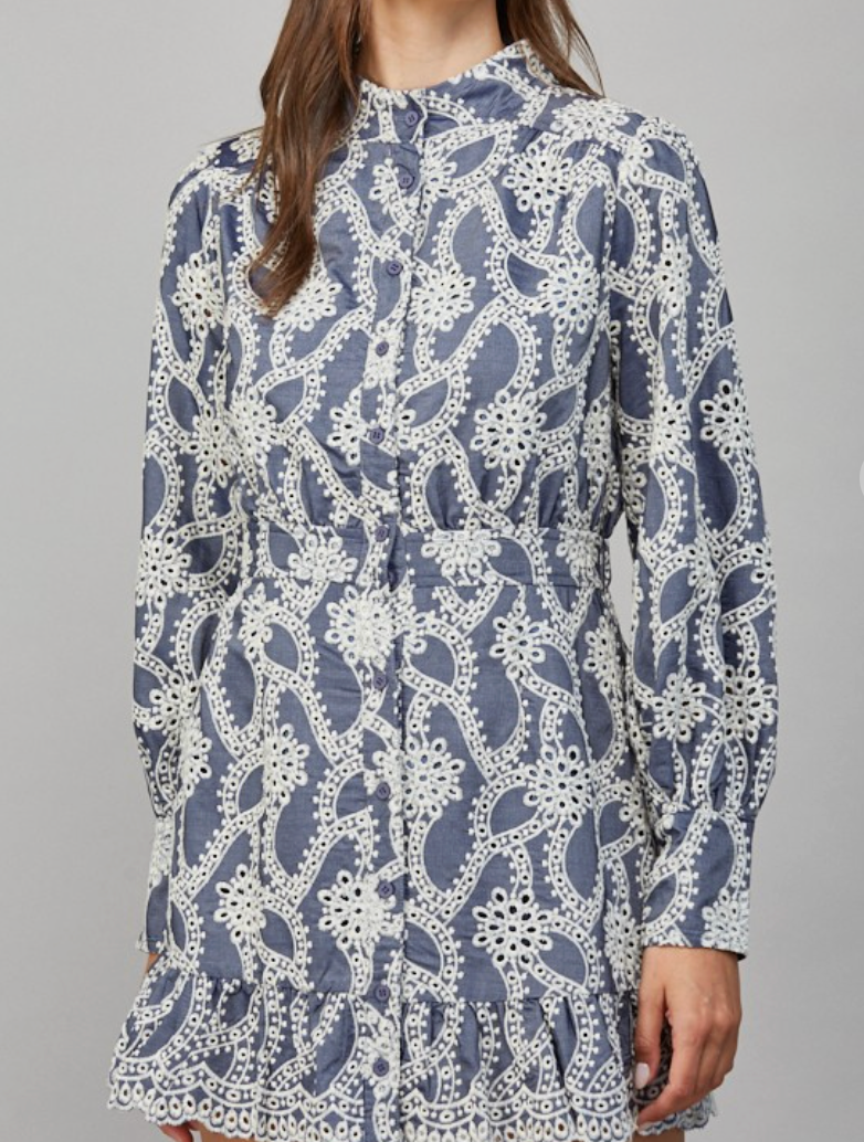 Elevate your wardrobe with this stunning high neckline button-down dress, crafted from delicate eyelet lace. The refined silhouette and intricate lace detailing create an effortlessly elegant look perfect for any occasion. From casual outings to special events, this versatile piece flatters every figure while offering comfort and style. The classic navy hue pairs beautifully with your favorite accessories, making it a timeless addition to your closet that you'll reach for again and again.