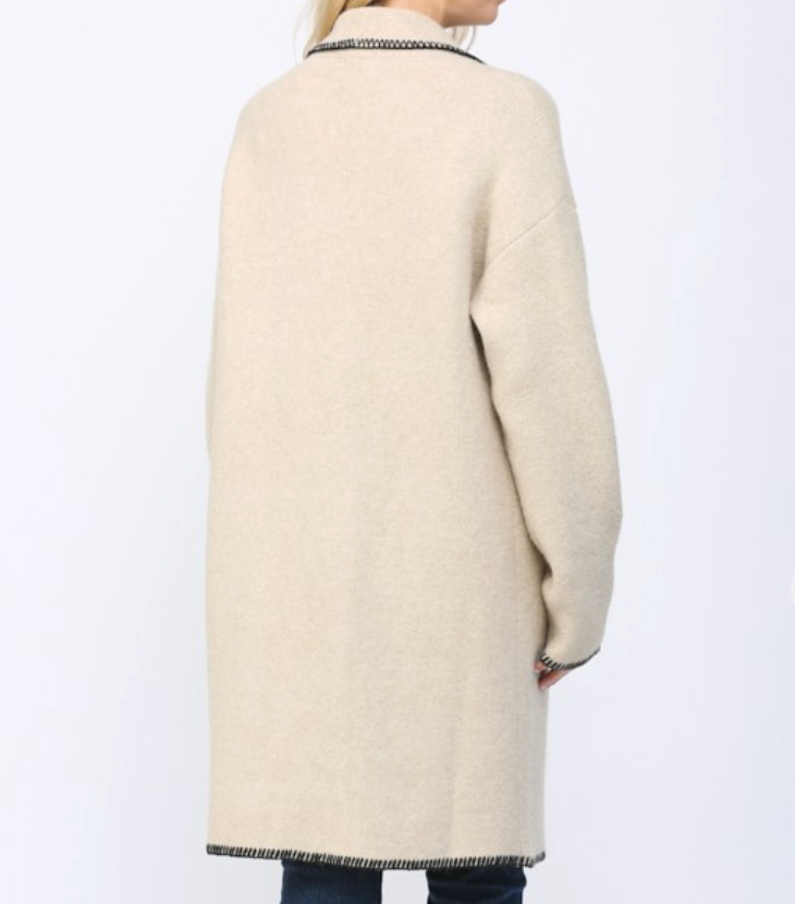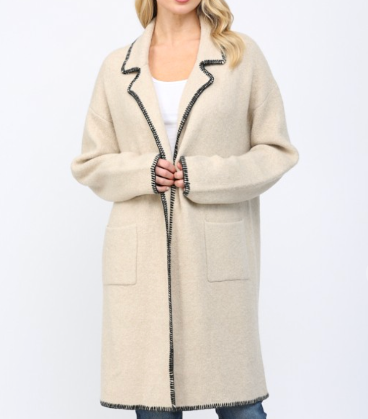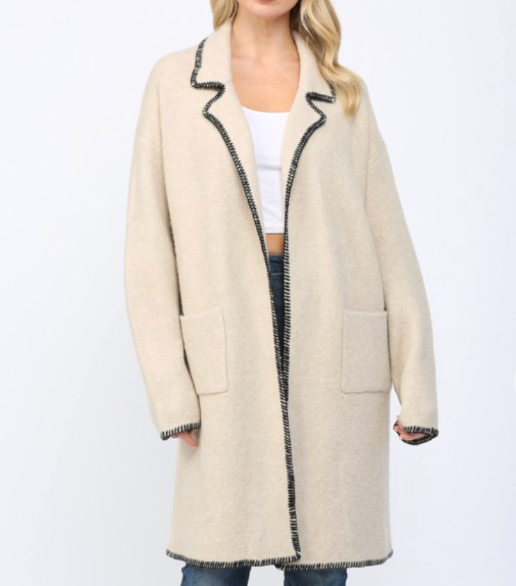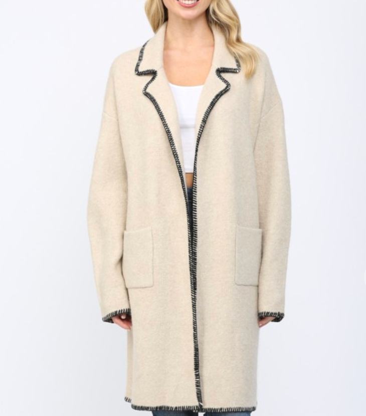 Elevate your layering game with this versatile coatigan that bridges the gap between comfort and polish. Featuring a striking contrast whipstitch detail that adds visual interest, a notched collar for a refined silhouette, and an open front design for effortless styling, this piece works beautifully over everything from casual tees to dresses. The oat tone offers a warm, neutral foundation that pairs seamlessly with your existing wardrobe. Whether you're heading to the office or out for the weekend, this coatigan delivers the structure of a coat with the ease of a cardigan—your new go-to layer for any season.