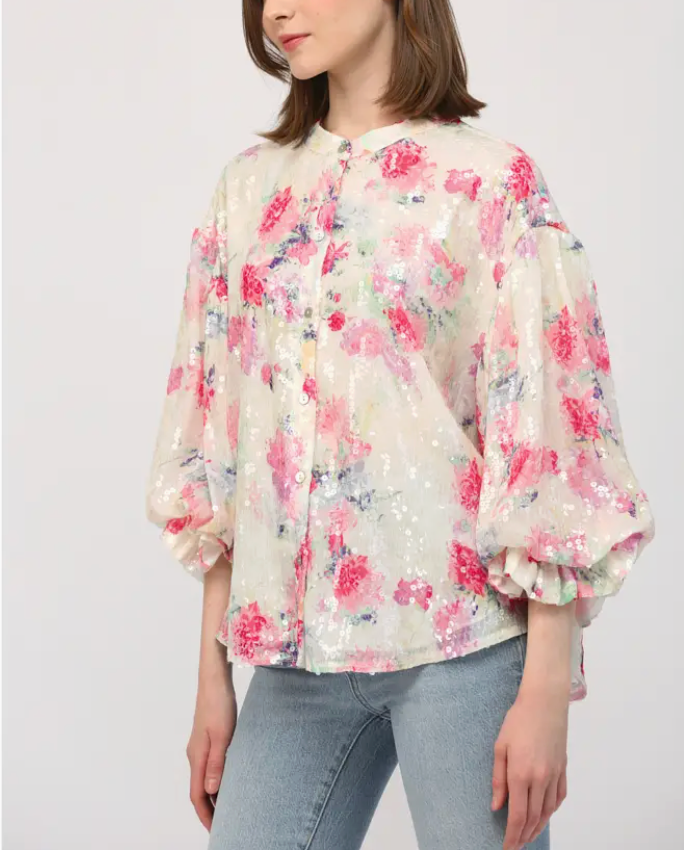 Elevate your wardrobe with the FT Kate Floral Blouse, where delicate florals meet eye-catching sequin details. The bubble sleeves add a playful, feminine silhouette that flatters every frame, while the shimmering sequin accents catch the light beautifully. Perfect for date nights, celebrations, or whenever you want to make a statement. Pair it with your favorite jeans or dress pants for an effortlessly chic look that transitions from day to night.