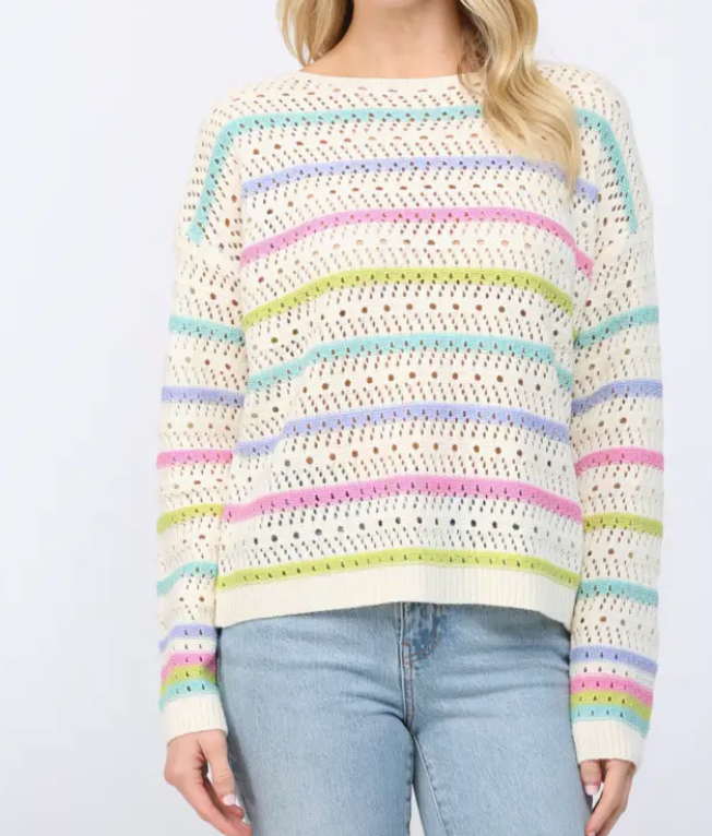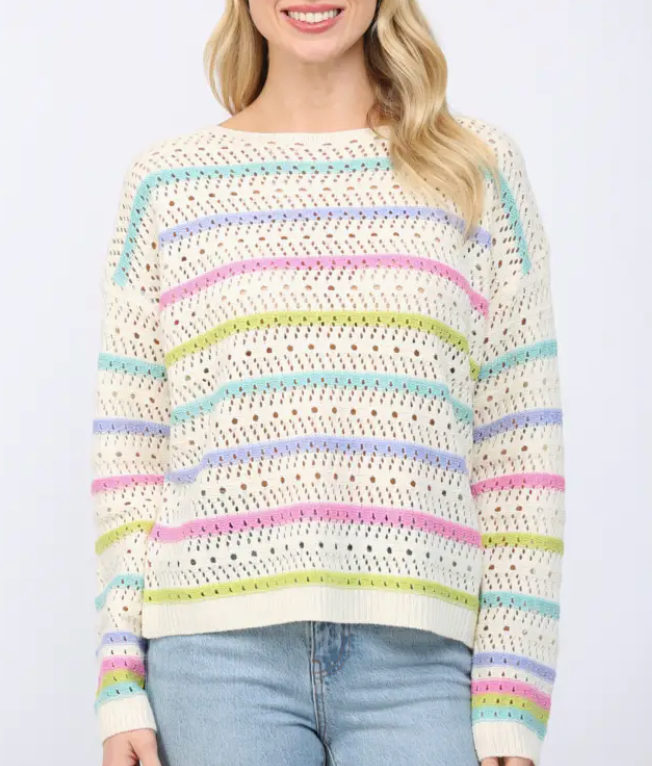 Elevate your spring wardrobe with this stunning open knit sweater, featuring a delicate stripe pattern that adds visual interest and dimension. The breathable knit construction keeps you comfortable during transitional weather, while the relaxed fit offers effortless style for layering or wearing solo. Perfect for casual outings or dressed-up occasions, this versatile piece pairs beautifully with everything from denim to skirts. Discover why open knit sweaters are the go-to choice for those seeking comfort without compromising on sophistication.
