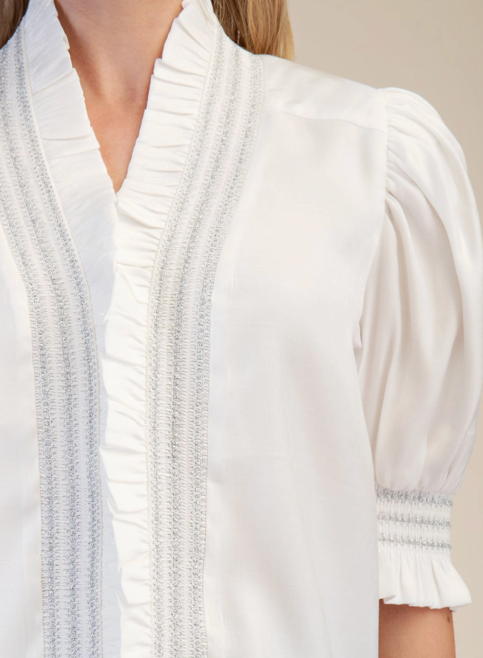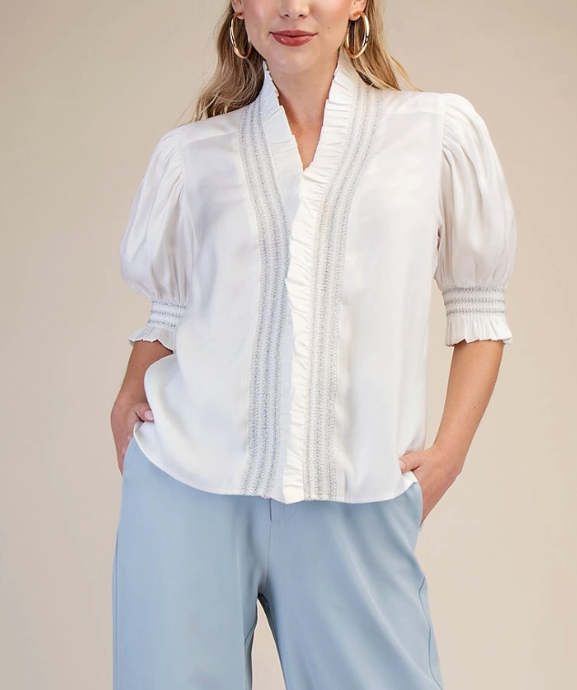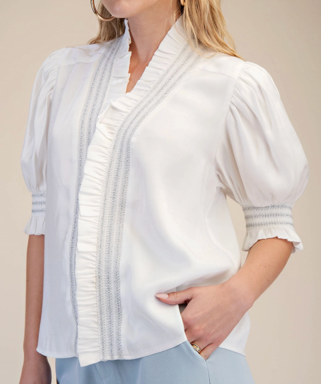 Elevate your everyday wardrobe with this stunning ivory blouse that effortlessly blends elegance and comfort. The delicate ruffle V-neckline draws the eye while the smocked detailing adds sophisticated texture and visual interest. Voluminous puff sleeves create a flattering silhouette that works beautifully for both professional settings and casual outings. Crafted with attention to detail, this piece transitions seamlessly from office to weekend, making it a versatile essential you'll reach for again and again.