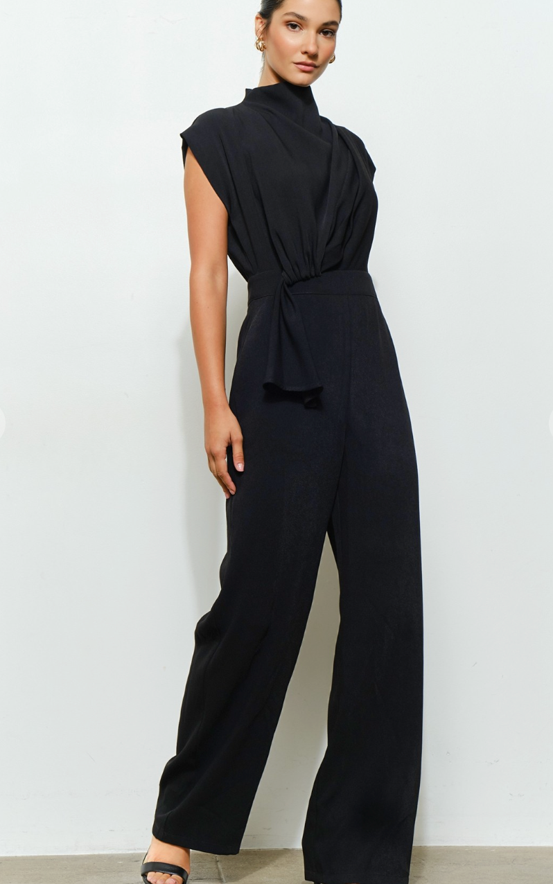 High Neck Draped Waist Cap Sleeve Jumpsuit -Elegant jumpsuit with softly draped front design -High neckline and cap sleeves for a polished silhouette -Asymmetrical tie-waist accent adds a refined touch -Hidden back zipper for a seamless look -Ideal for formal dinners, receptions, or special gatherings