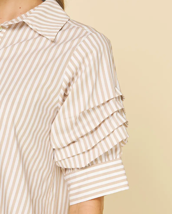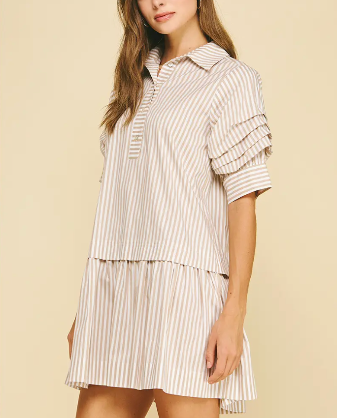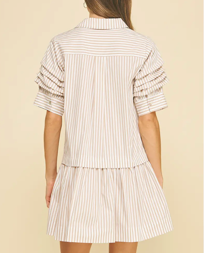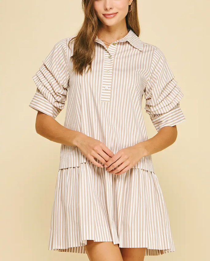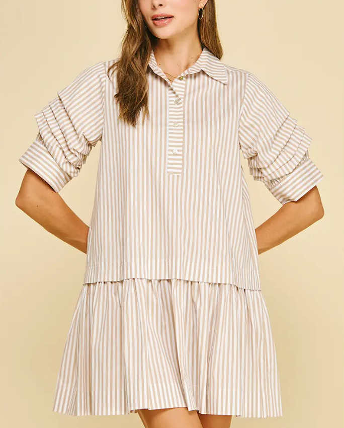 Elevate your everyday wardrobe with the IP Carolina Stripe Dress—a timeless piece that effortlessly transitions from office to weekend. This classic button-down features a refined collar and flattering tiered silhouette that creates beautiful dimension. Delicate shirring at the sleeves adds a touch of sophistication while ensuring a comfortable, tailored fit. Perfect for those who appreciate quality construction and versatile style, this dress pairs beautifully with heels, flats, or sneakers for endless outfit possibilities.
