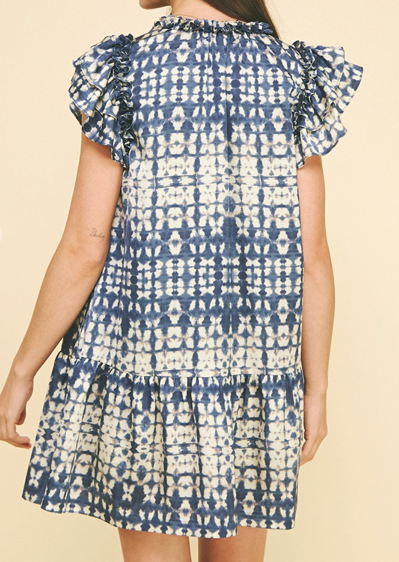 Elevate your style with this navy mini dress featuring elegant ruffled details at the neck and sleeves for a feminine touch. The self-tie at the neck adds adjustable charm, while the tiered design enhances movement and grace. Practical side pockets combine fashion with function, making this dress perfect for day-to-night wear.