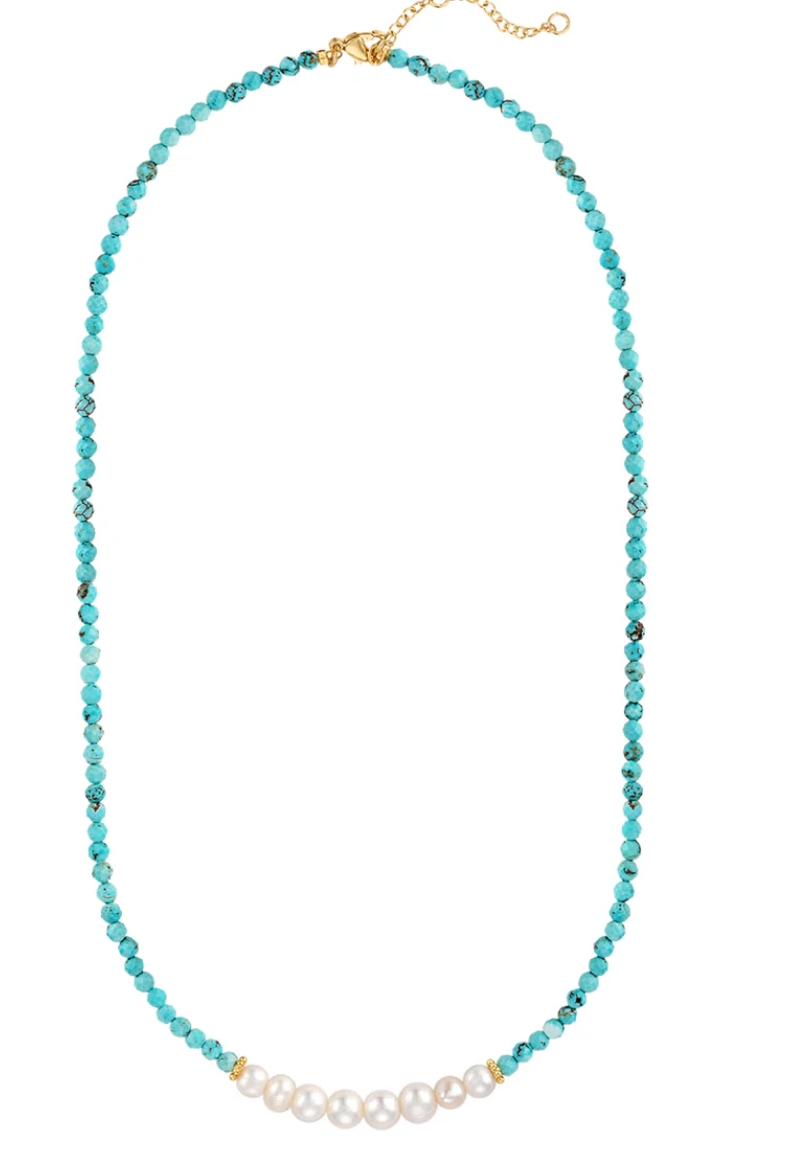 - This necklace showcases a strand of genuine turquoise beads accented with subtle marbling. At the centre, the luminous pearls and golden touches add a contrast to the gorgeous color, creating ocean hues.