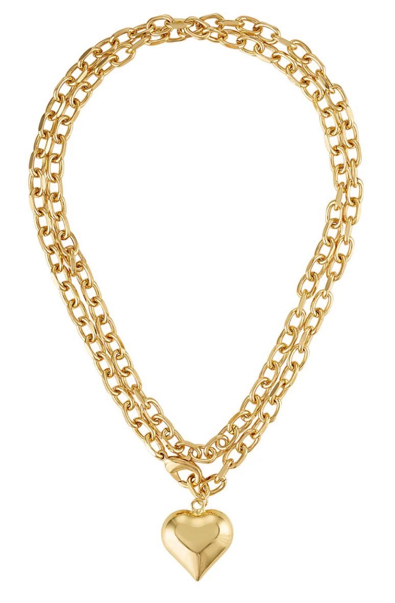 - This necklace features a double-layer chunky interlocking links that cascades a voluminous curved heart pendant for a standout statement.