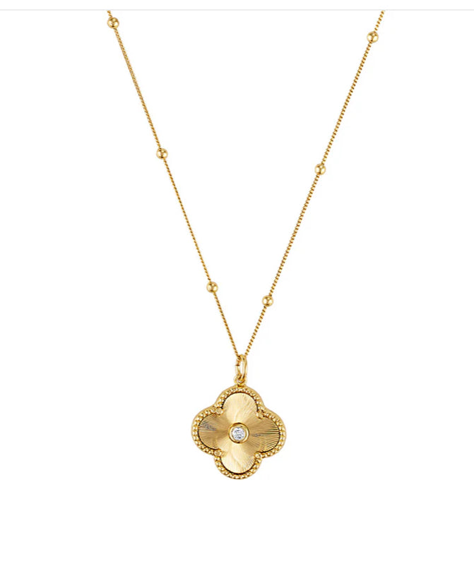 - This necklace features a gold satellite chain that suspends a four leaf clover pendant etched with intricate detailing and a tiny stone at its center, adding subtle luxury.