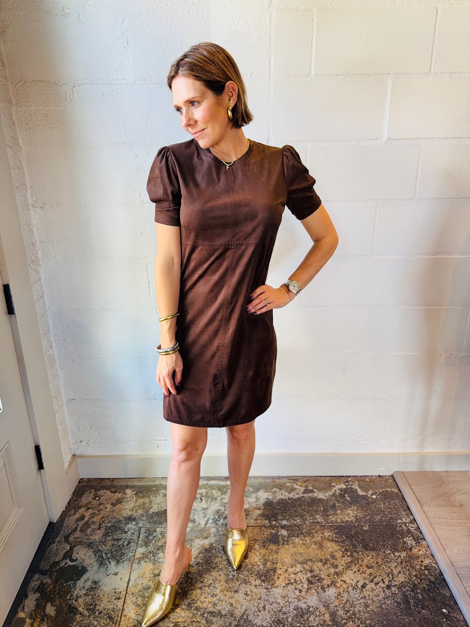 The DEMI short sleeve mini dress with a seaming detail finish. Dress up or wear casual. Solid color suede woven on standard fit.