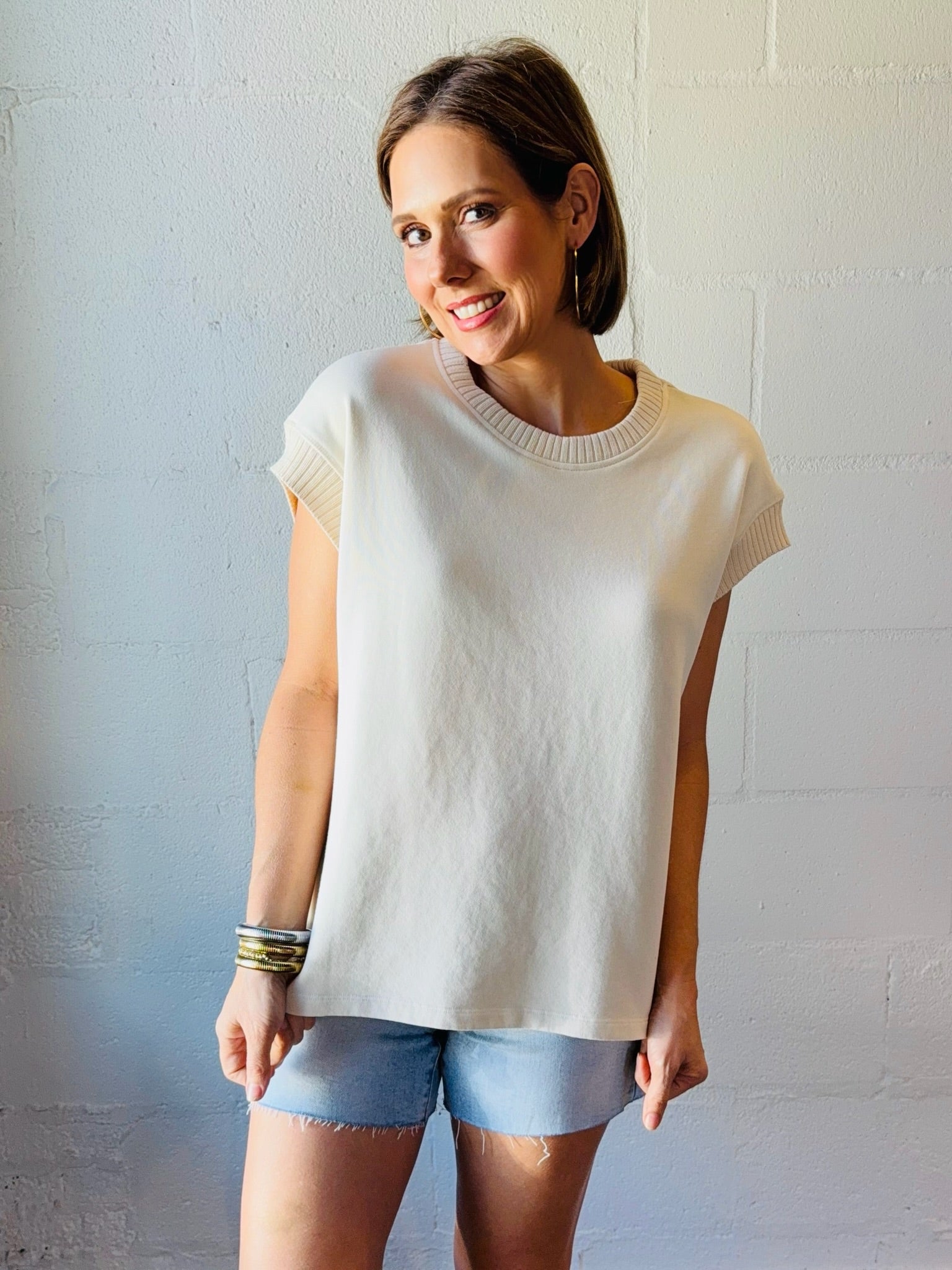 Effortless comfort meets relaxed style with this vanilla cotton terry crew neck top. Crafted from soft, breathable cotton terry fabric, it features distinctive dropped sleeves that create an easy, oversized silhouette perfect for casual layering. Finished with cotton rib trim bands at the neckline and cuffs for a polished, put-together look. An everyday essential that transitions seamlessly from weekend wear to laid-back office days.