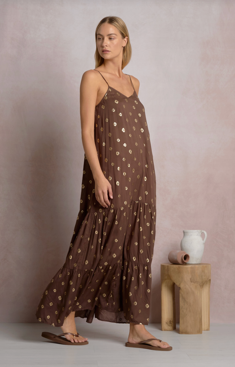 The LE BRINLEY MAXI is your go-to piece for effortless elegance. This brown sleeveless maxi dress features a stunning gold foil print that catches the light beautifully, making it perfect for everything from casual outings to special occasions. The flowing silhouette offers comfort and movement, while the rich brown tone pairs seamlessly with your favorite accessories. Dress it up or down—this versatile staple deserves a spot in every wardrobe.