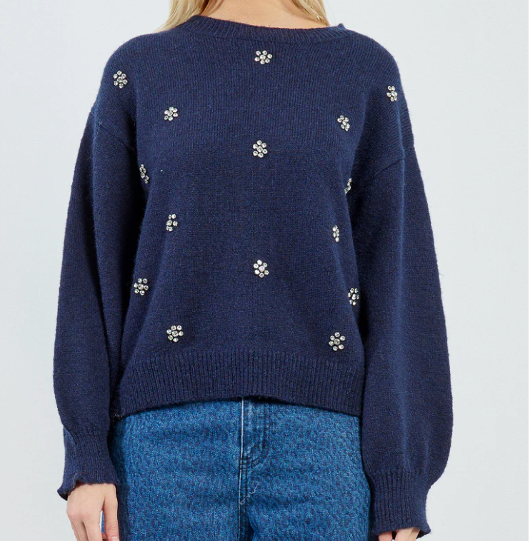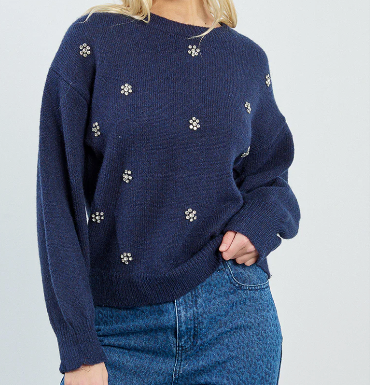 Elevate your wardrobe with the MB Krystal Navy Sweater, featuring exquisite crystal embellishments that add a touch of sparkle to classic comfort. Crafted in a rich navy hue, this sweater seamlessly blends timeless style with eye-catching detail, perfect for both casual outings and special occasions. Experience warmth and elegance in one standout piece that promises to enhance your everyday look.