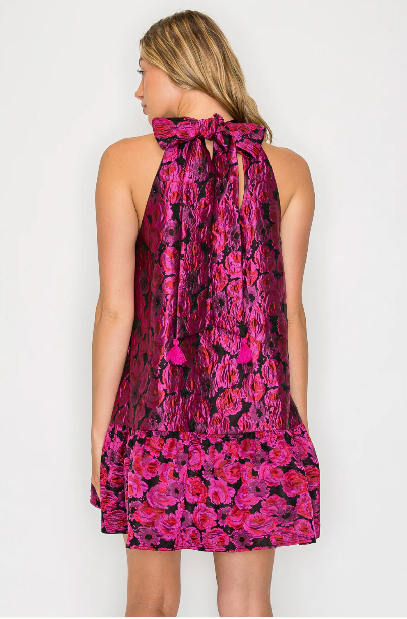 Command attention in this stunning metallic floral dress, where a rich fuchsia jacquard blooms over a dramatic black background. The elegant high halter neckline creates a sophisticated silhouette that beautifully frames the shoulders, while the playful tiered ruffle hem adds a touch of flirty, modern charm. With its effortless swing fit, this dress promises both comfort and show-stopping style for your most anticipated cocktail parties and festive celebrations.