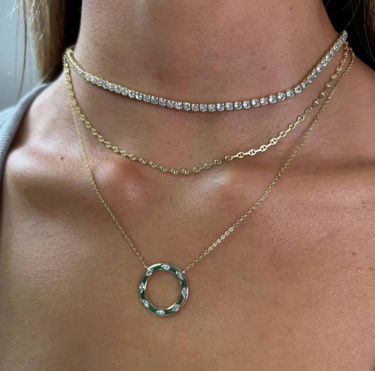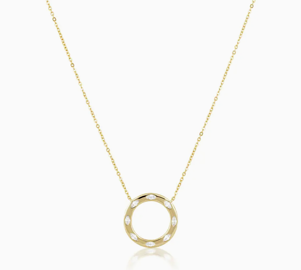 The Oasis Eternity Necklace features a stunning circle pendant embellished with sparkling CZ stones. Elevate your everyday look with this elegant and timeless piece.