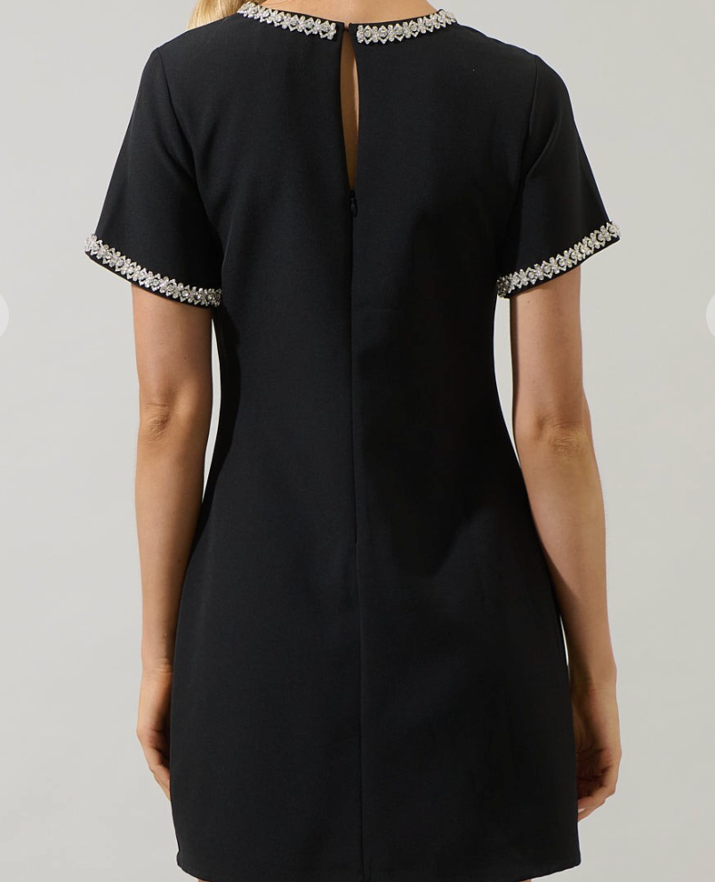 Turn heads effortlessly at your next glamorous event with this sophisticated piece. This mini shift dress features short sleeves, rhinestone trims on the neckline and sleeves, an invisible back zipper, and a sleek, clean A line silhouette. Style with strappy heels, a statement bag, and dazzling earrings to complete your evening ready look.