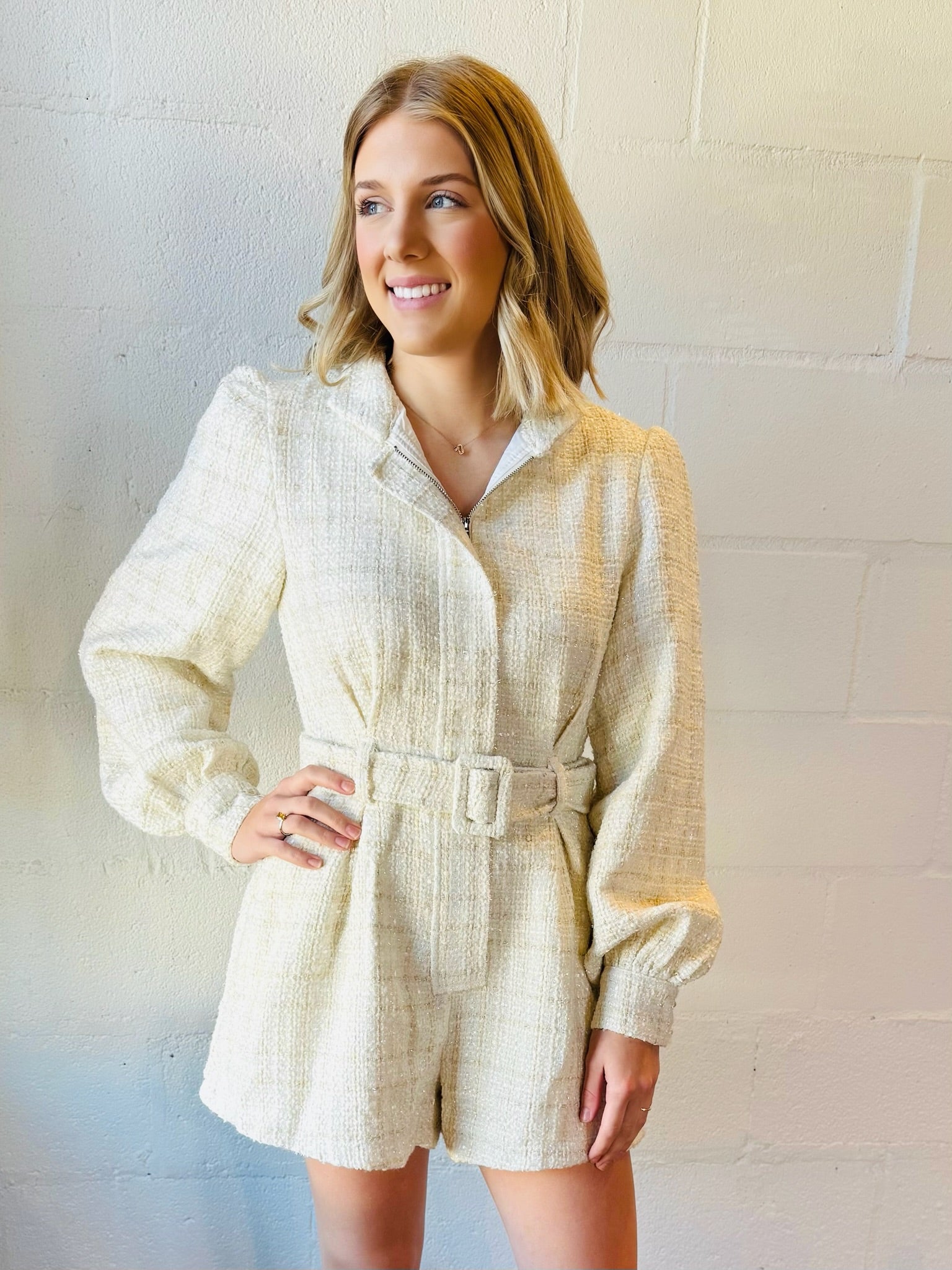 Elevate your style with the SO CHARA Romper, crafted from luxurious cream tweed for a timeless, sophisticated look. This romper combines classic texture with a modern silhouette, making it perfect for both daytime events and evening outings. Its tailored fit enhances your shape while offering comfort and ease, helping you stand out effortlessly at any occasion.