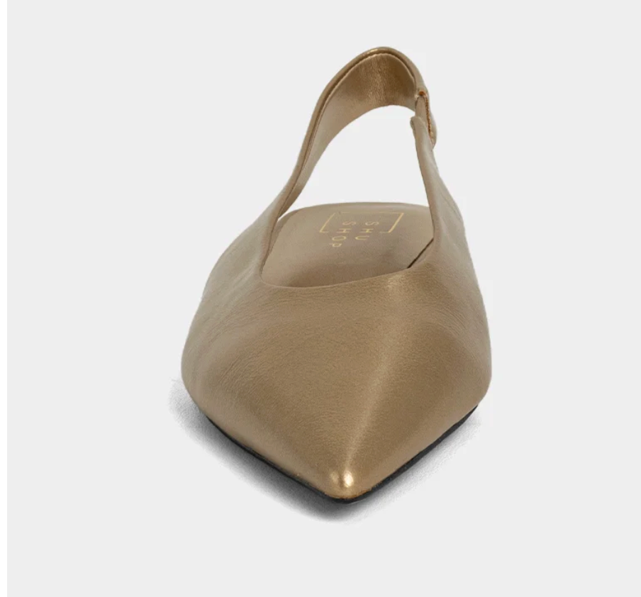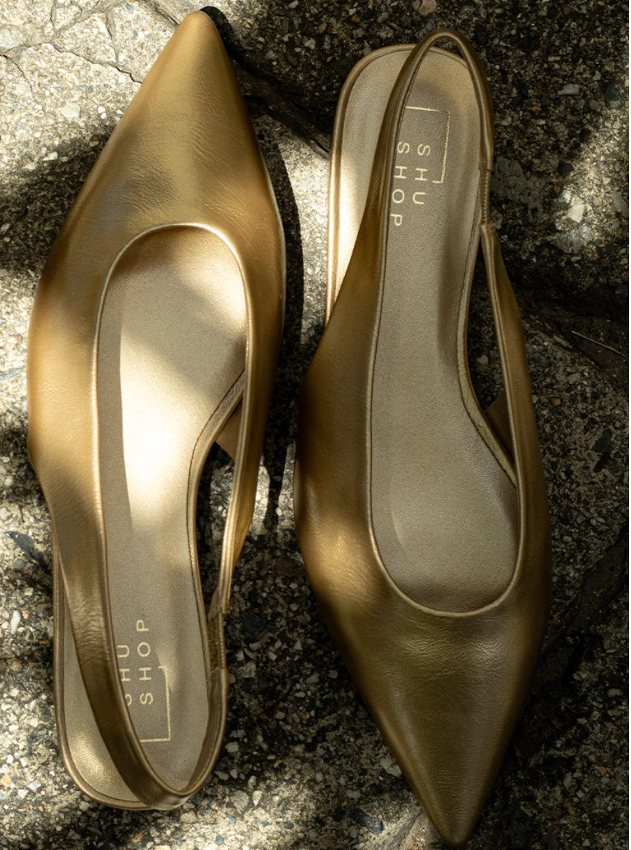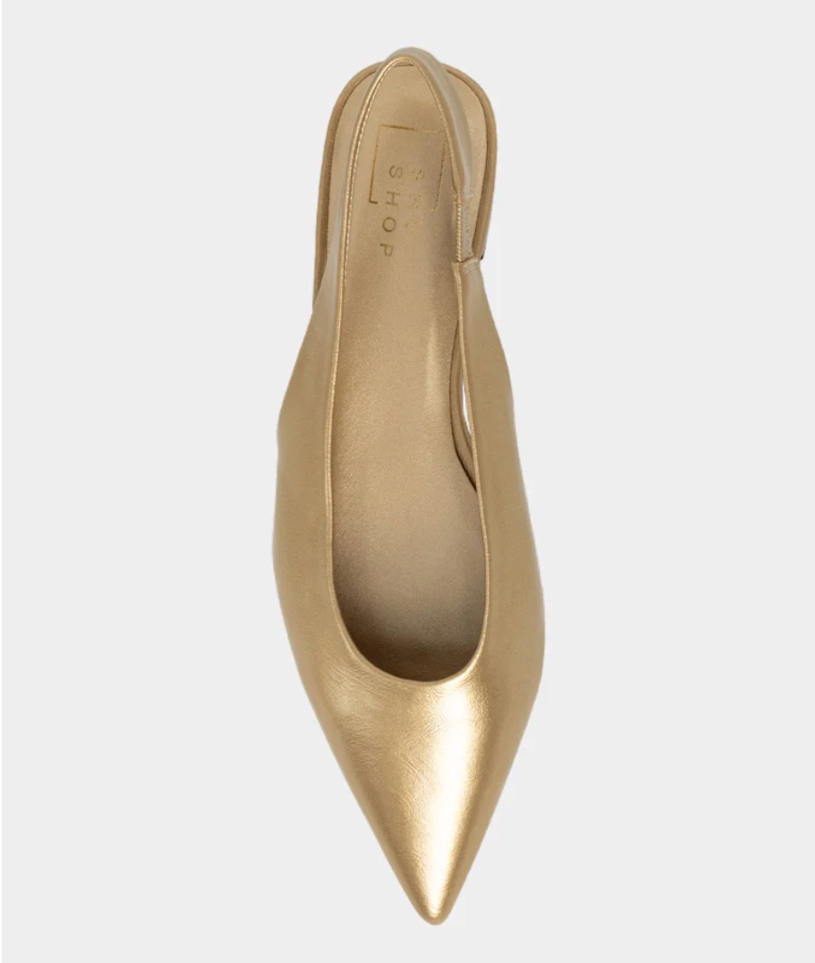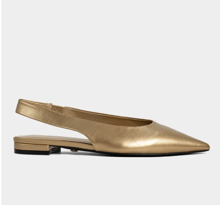 Chic, polished, and just the right amount of glam. The Amelia Gold slingback flat elevates your everyday look with its sleek pointed toe and lustrous gold finish. Whether you're heading to the office, brunch, or a night out, this shoe brings instant sophistication-with all-day comfort.