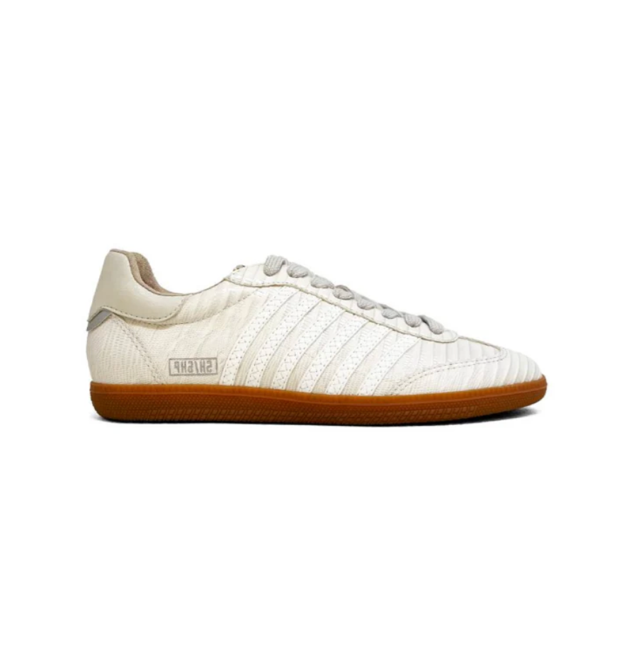 Step into modern sophistication with the Stevie Sneaker. Combining warm bone and soft beige tones, its side-stitched stripes create subtle texture, while luxurious lizard material overlays elevate the design. Finished with a metallic silver heel tab and a classic gum sole, this sneaker balances everyday comfort with stylish edge, perfect for upgrading your casual wardrobe.